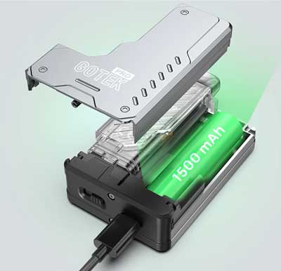 Το Gotek Pro τροφοδοτείται από ισχυρή ενσωματωμένη μπαταρία 1500mAh, προσφέροντας εκτεταμένη αυτονομία για άτμισμα χωρίς διακοπές. Όταν χρειάζεται φόρτιση, η μπαταρία μπορεί να φορτιστεί γρήγορα μέσω της θύρας USB Type-C 1A, εξασφαλίζοντας άμεση ετοιμότητα.