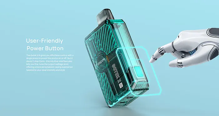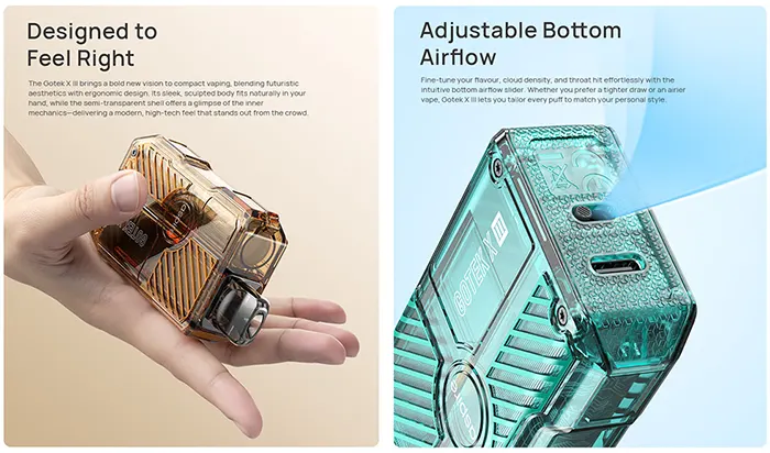 Ξεχάστε τα κουμπιά και τις πολύπλοκες ρυθμίσεις! Με το σύστημα ενεργοποίησης μέσω εισπνοής, το Gotek X III προσφέρει μια απλή και άμεση εμπειρία, κατάλληλη τόσο για αρχάριους όσο και για έμπειρους ατμιστές. Ο μοντέρνος, εργονομικός σχεδιασμός εφαρμόζει τέλεια στο χέρι, ενώ το ημιδιαφανές περίβλημα αποκαλύπτει τα εσωτερικά στοιχεία, προσδίδοντας μια high-tech αισθητική που ξεχωρίζει.