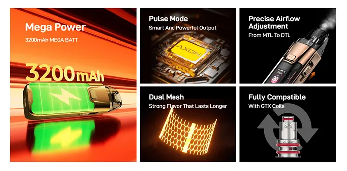 Εξοπλισμένο με μεγάλη οθόνη TFT 0,96”, που βελτιώνει την ορατότητα των ρυθμίσεών σας, σε συνδυασμό με τις αντιστάσεις Dual Mesh για πλούσια γεύση και μεγαλύτερη διάρκεια ζωής, καθώς και με την αναβαθμισμένη, ακριβή ροή αέρα, σας προσφέρει μια ευρεία γκάμα εμπειριών ατμίσματος από MTL έως DTL.