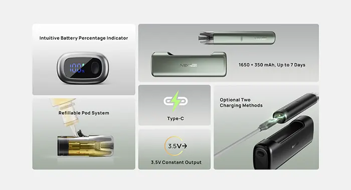 Σύγχρονο, αποδοτικό και εξαιρετικά πρακτικό, το Aspire Nexi Pro αποτελεί μια ολοκληρωμένη λύση που καλύπτει κάθε ανάγκη στο καθημερινό άτμισμα. Προσφέρει αναβαθμισμένες λειτουργίες και μοντέρνο σχεδιασμό, κάνοντας την εμπειρία ατμίσματος πιο άνετη και απολαυστική από ποτέ.