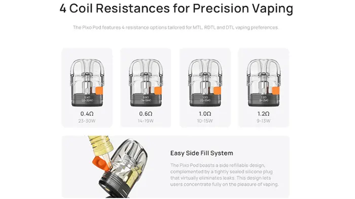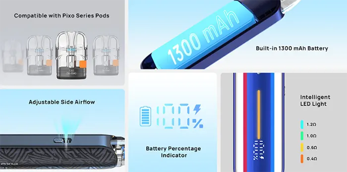 Είναι πλήρως συμβατό με τις κάψουλες της σειράς Pixo και διαθέτει ρυθμιζόμενη ροή αέρα, καλύπτοντας τις ανάγκες τόσο των χρηστών που προτιμούν MTL (τσιγαρίσιο) όσο και εκείνων που επιλέγουν DL (πνευμονικό) άτμισμα.