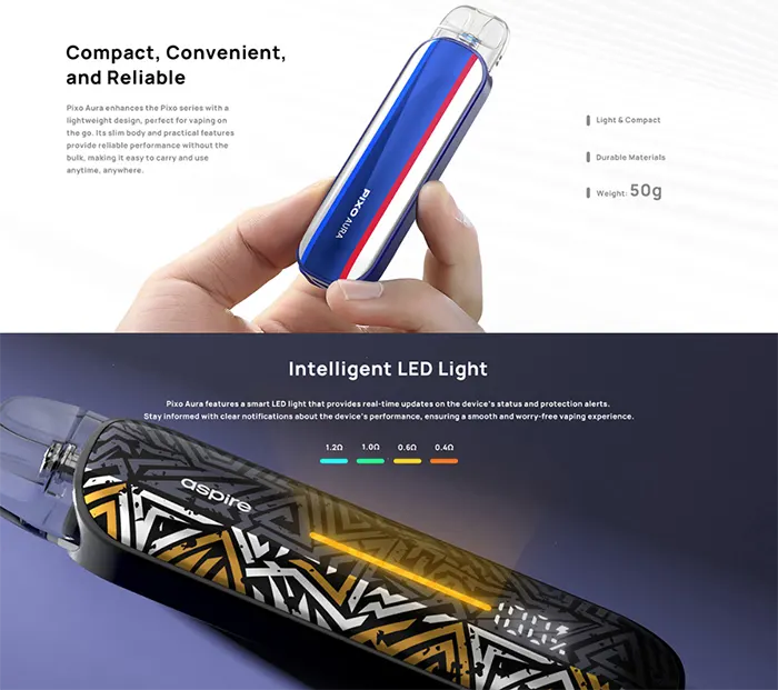Το Aspire Pixo Aura συνδυάζει κομψότητα και απόδοση σε μια πρακτική, compact συσκευή που ικανοποιεί κάθε ανάγκη του σύγχρονου ατμιστή. Με μινιμαλιστικό design, ματ φινίρισμα και αίσθηση premium στο χέρι, προσφέρει άνετη και απολαυστική εμπειρία χρήσης από την πρώτη στιγμή.