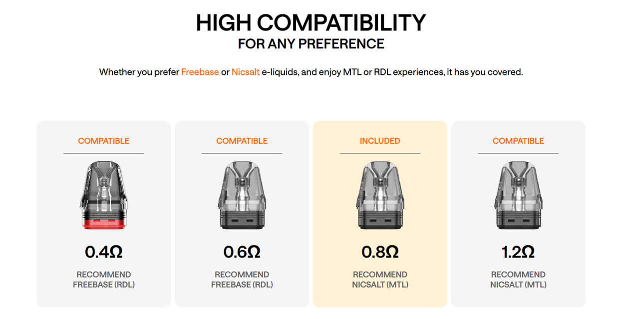 Το Oxva Xlim GO Pod Kit είναι συμβατό με τρεις αντιστάσεις (0,6Ω / 0,8Ω / 1,2Ω), προσφέροντας πλούσια γεύση στα υγρά αναπλήρωσης και αξιοπιστία χάρη στη στεγανότητά τους.